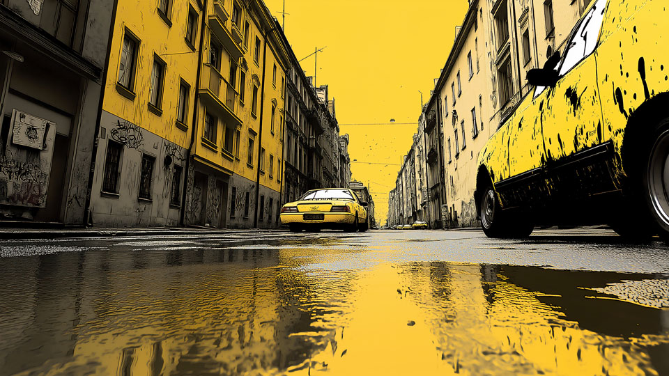 A vibrant and colorful cartoon-style doodle of an abstract representation of people, with exaggerated features like big eyes and wide smiles, surrounded by bold shapes and patterns that suggest movement or activity. The background is filled with various elements such as buildings, cars, trees, and flowers, all rendered in bright colors to create a lively atmosphere.