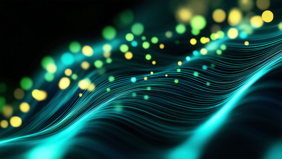 A digital illustration of glowing light trails, blue and orange, representing fast-moving data transfer in the internet or fiber-optic network on a black background. The lines form curved paths, symbolizing speed and connectivity.