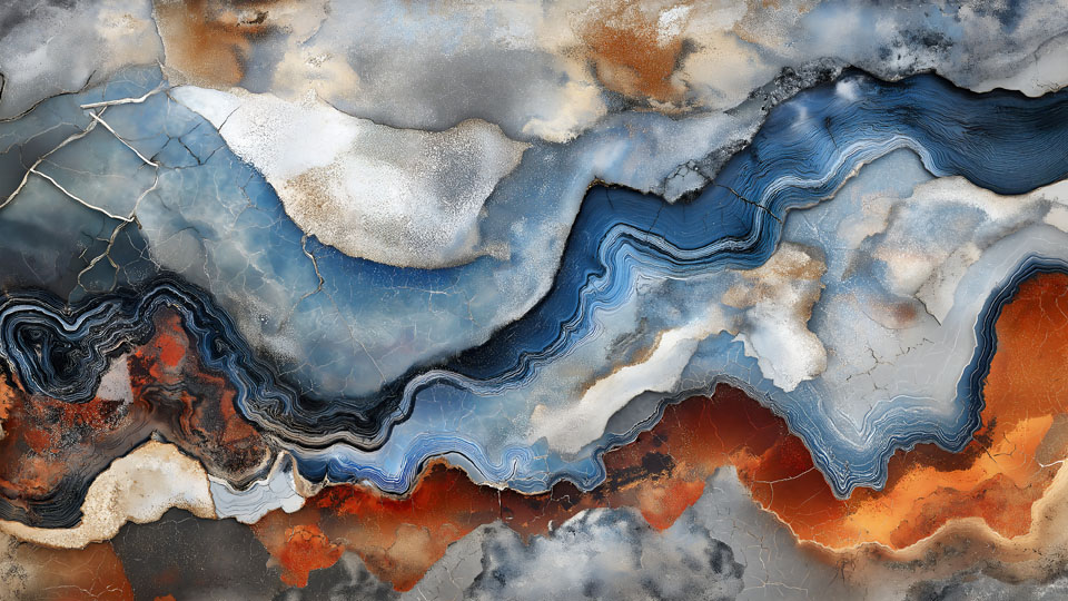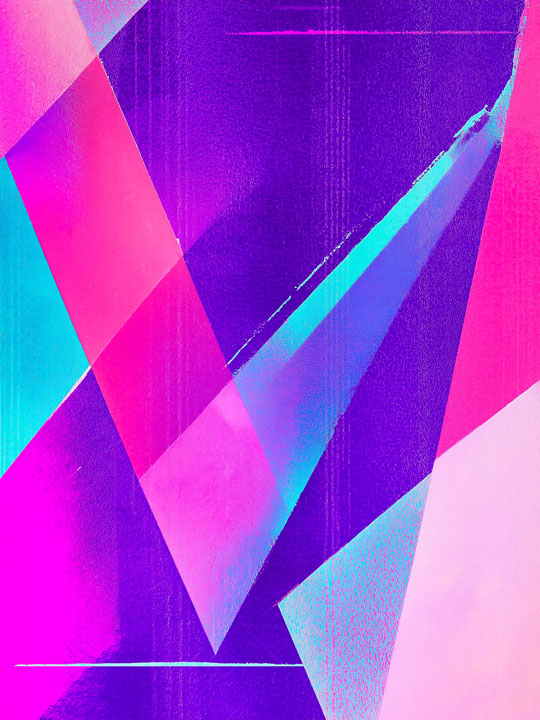 A close-up of an abstract geometric pattern made from various shades and shapes, including triangles in brown, blue, gray, and purple, creating intricate patterns on the wall surface.