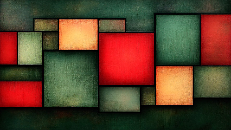 A digital art piece showcasing geometric shapes in red, green, and brown, arranged in a retro flat vector style. Ideal for modern interior design, wall prints, or posters with a bold and elegant aesthetic.